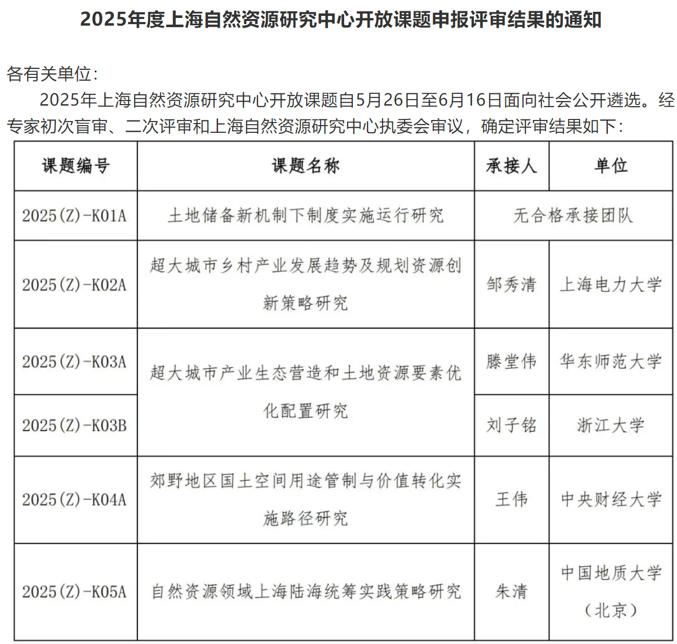 近日,2025年度上海自然资源研究中心开放课题申报评审结果正式公布。公司资源经济与绿色发展研究中心主任邹秀清教授申报的《超大城市乡村产业发展趋势及规划资源创新策略研究》课题成功获批,成为本年度五家获资助单位之一。