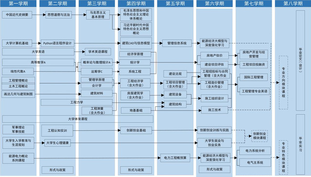 本专业员工知识结构建立在工程技术、工程经济、工程管理、工程法律和计算机科学与技术五大知识平台上,应具备工程力学、土木工程概论、工程管理导论、工程测量、建筑材料、施工技术、画法几何与建筑制图、房屋建筑学、施工组织设计、建筑结构、工程经济学、工程项目管理、工程造价管理、工程招投标与合同管理、建设法规、建筑CAD与信息模型等方面的基本理论和基本知识,同时受到较好的工程实践训练,具有一定的建设项目开发、设计、组织、运维和管理的基本能力,并具备综合运用所学知识分析和解决工程项目管理方面专业问题的能力,成为“基本理论+工程实践+能源电力特色+创新与运营能力”的高素质应用型和复合型专业人才。