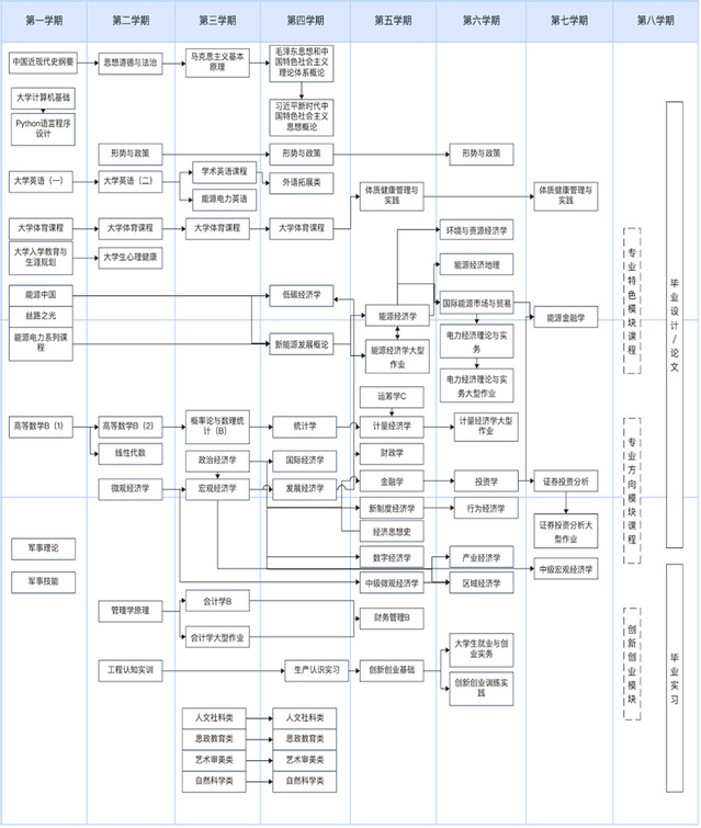 政治经济学、微观经济学、宏观经济学、统计学、财政学、金融学、计量经济学、会计学、环境与资源经济学、能源经济学、电力经济理论与实务等课程。