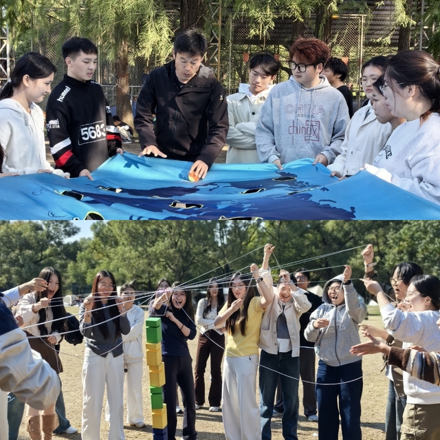 随后,一系列精彩刺激、考验团队协作能力的素拓项目依次展开。“合力筑塔”要求队员们精准控制绳索,齐心协力将散落的积木块筑成高塔;“世界球”需要大家共同掌控一幅绘有世界地图的帆布,让网球沿预定路线滚动;“同心击鼓”更具挑战,每位队员牵动一根绳子,默契控制鼓面升降,共同完成击球;“传球接力”则在快速移动与精准传递中,提升团队协作效率与信任度。活动尾声,教练进行点评,希望同学们将活动中展现的团队精神和协作意识,转化为攻克科研难题、勇攀学术高峰的力量。