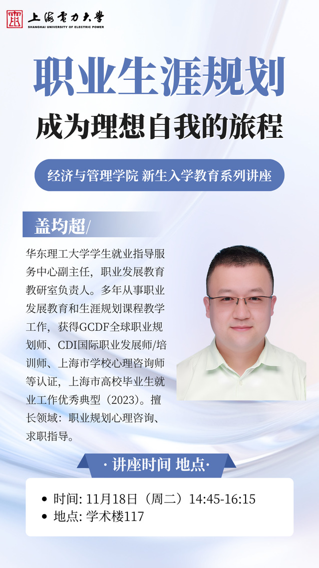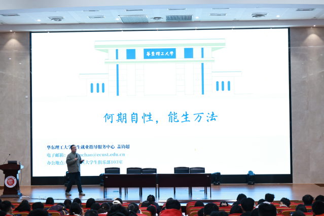 为引导新生树立科学的职业发展观念,提升生涯规划意识。11月18日,best365中国官方网站开展入学教育——职业生涯规划专题讲座。本次活动特邀华东理工大学员工就业指导服务中心副主任、职业发展教育教研室负责人盖钧超担任主讲人,以“职业生涯规划——成为理想自我的旅程”为主题,通过系统阐释五大核心理论,为同学们构建科学的生涯规划认知体系,从提升认知到付诸实践,全方位明确大学发展路径与职业探索方向。