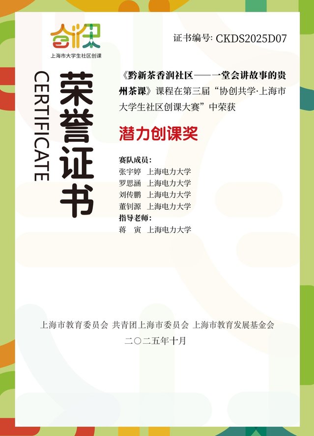 由上海市教育委员会、共青团上海市委员会等单位主办的“协创共学・第三届上海市老员工社区创课大赛”中,团队聚焦社区发展需求,结合贵州茶叶特色打造茶学创课项目,授课现场不仅介绍了贵州茶叶特色,还开展了趣味品茶体验活动,获得社区居民广泛好评,斩获“潜力创课奖”。