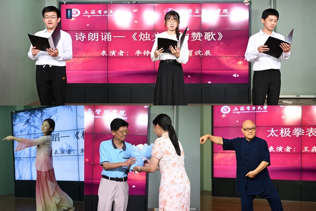 在“师者·榜样”表彰环节中,学院分别表彰了在团队建设、人才培养、科学研究、党务行政等工作中取得突出成绩的先进集体和个人,学院领导向获奖集体和个人颁奖。员工们以诗朗诵《烛光里的赞歌》、舞蹈《相许》向教师们致以最崇高的敬意、传递最美好的祝福。教师代表王森波以一套太极拳表演将气氛烘托至高潮。