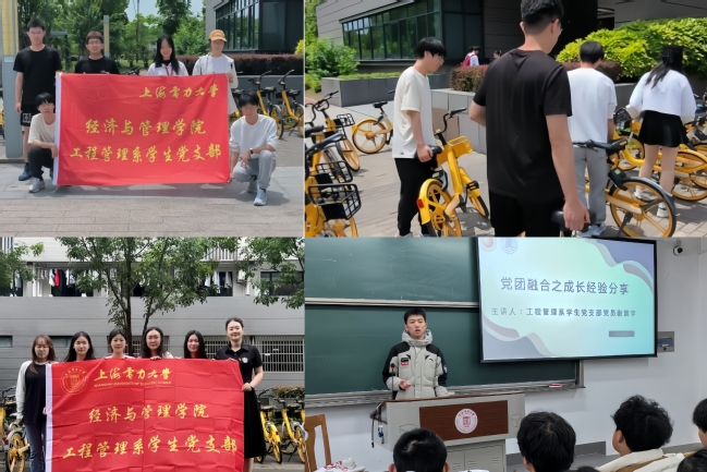 工程管理系员工党支部党员谢宸宇从个人情况、校园生活、学习经历和心态建设四个方面向同学们分享了自身作为头雁领航员的成长路径;工程管理系员工党支部举办了以“绿色出行,有序共享”为主题的“我为群众办实事”活动,在上课高峰期后对校园内的共享单车进行整理,以实际行动推动绿色出行文化。
