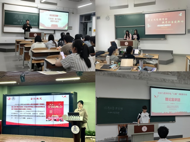 应用经济系员工党支部党员毛崇宇以“青年践行党的纪律方针”为题进行了生动而深刻的党课宣讲,引导同学们提高思想觉悟,严守党的纪律和规矩;应用经济系员工党支部党员钮引航、胡菁以“学习思想强信念,挺膺担当建新功”为题开展宣讲,引导团员们进一步凝聚青春力量,展现青年担当;工商管理系员工党支部陈妍君分享了“全国两会”相关精神;工程管理系员工党支部张宇冰受邀参加2023401班团日活动,通过理论宣讲带领同学们一起思考如何做一名“四讲四有”好青年。